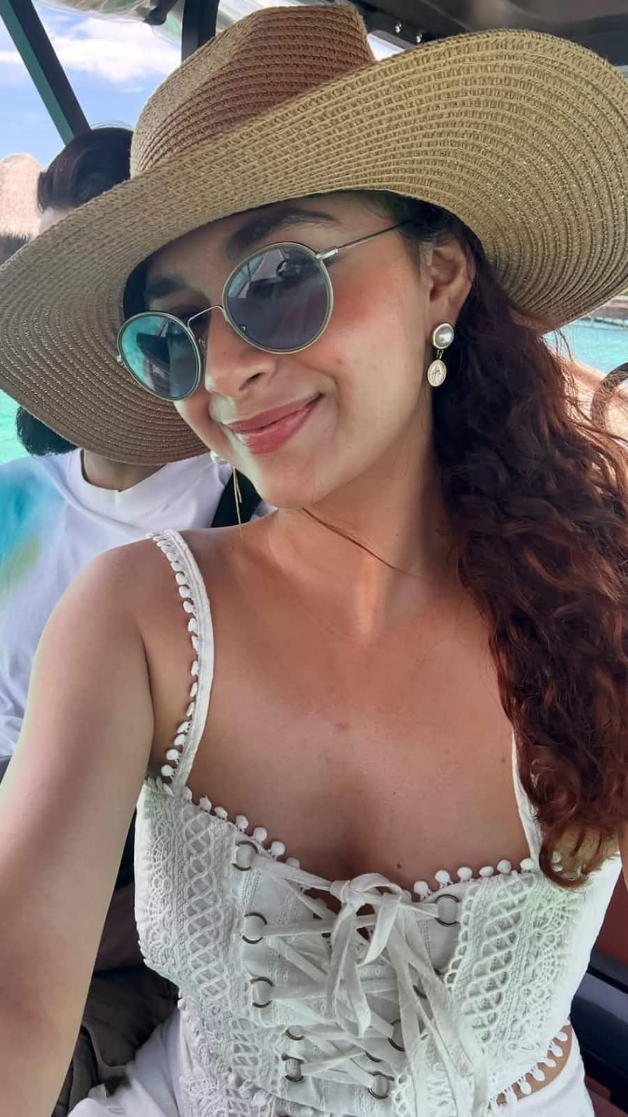 She spent time unwinding and watching sunsets in a relaxed white and blue outfit