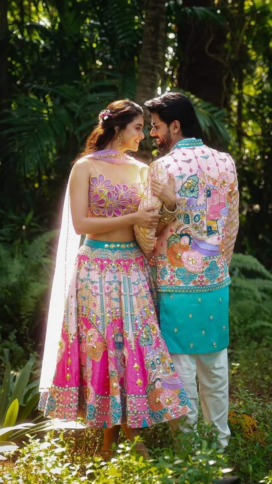 For a party in Goa, the couple embraced vibrant colours in true Goan style. Keerthy wore a printed long jacket over her white co-ords, while Antony matched her in a printed shirt. The prints carried moments from their journey together