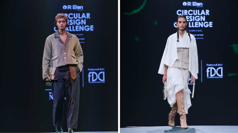 If there was one name that turned heads for innovation and intent, it was Varshne B, the young designer from NIFT Chennai whose label CRCLE presented the collection “Symbiosis.” Using 100% biodegradable Wegawool from Calotropis plant fibres, banana leather, Korai grass bags, and handwoven khadi denim in kala cotton, she crafted a collection that felt earthy, contemporary, and gender-neutral. The neutral tones and clean silhouettes made her designs universally appealing. Varshne’s accessories made from stainless steel scrap and post-consumer fabric perfectly embodied her “nothing wasted” ideology. Her efforts earned her the R|Elan™ Circular Design Challenge (CDC) award, marking her as one of the most promising new voices in India’s circular fashion landscape.