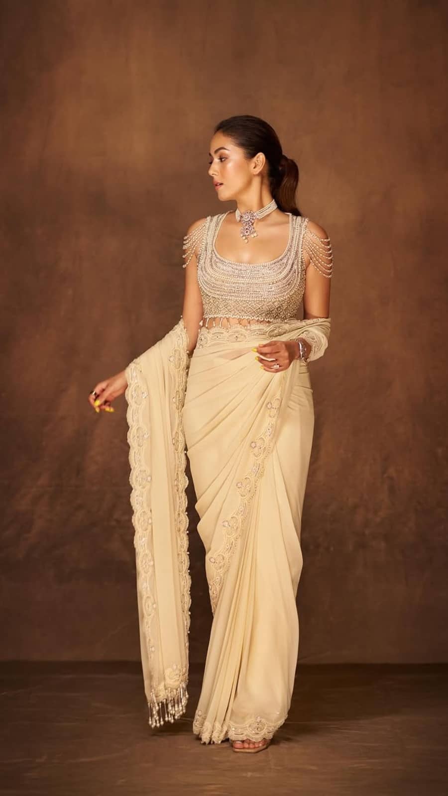 Sporting earthy nude, Mira looks stunning in a delicately embellished saree that drapes beautifully, paired with a matching blouse