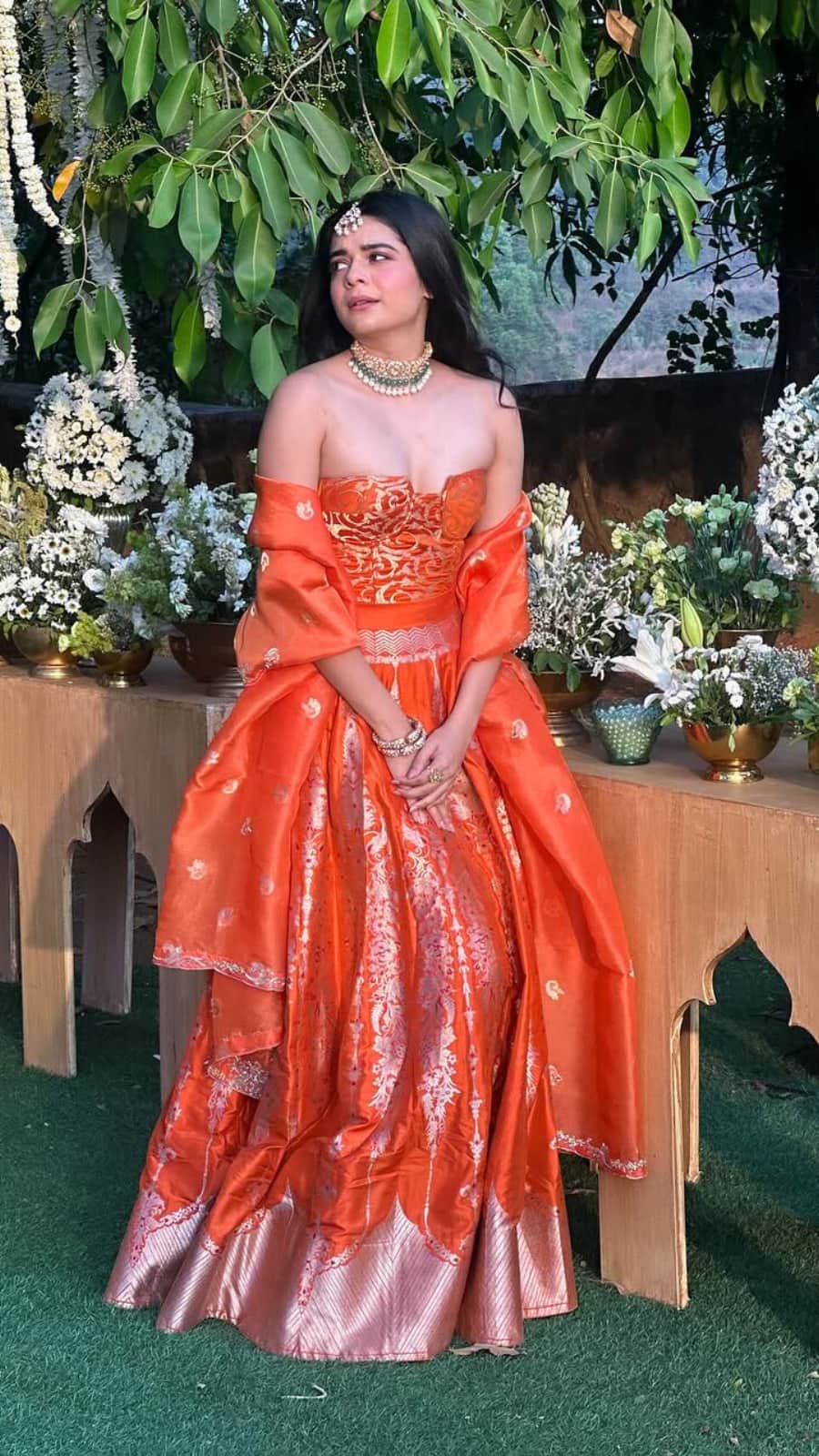 Mithila, who often steps out in ethnic wear, exudes elegance in a rich pink-hued lehenga set with gold embroidery