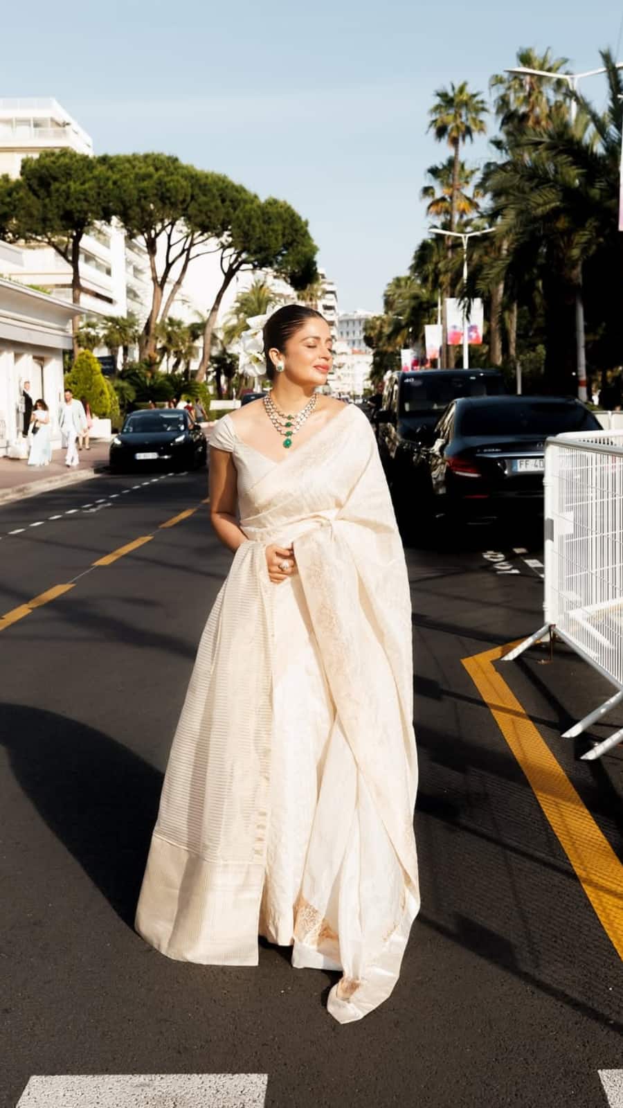 She is a vision in this beautiful ivory saree, accessorised with emerald jewellery