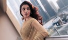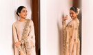 Rashmika Mandanna stunned in a beige ethnic suit paired with a bun adorned with gajra during Kuberaa promotions in Chennai. Her gold-embroidered outfit, dewy makeup, and traditional accessories added to the charm.
