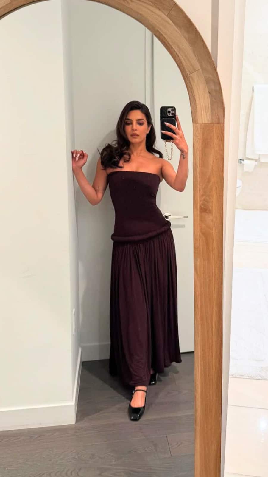 Priyanka looks stylish in a strapless mahogany dress in supple jersey, paired with leather Mary Jane flats