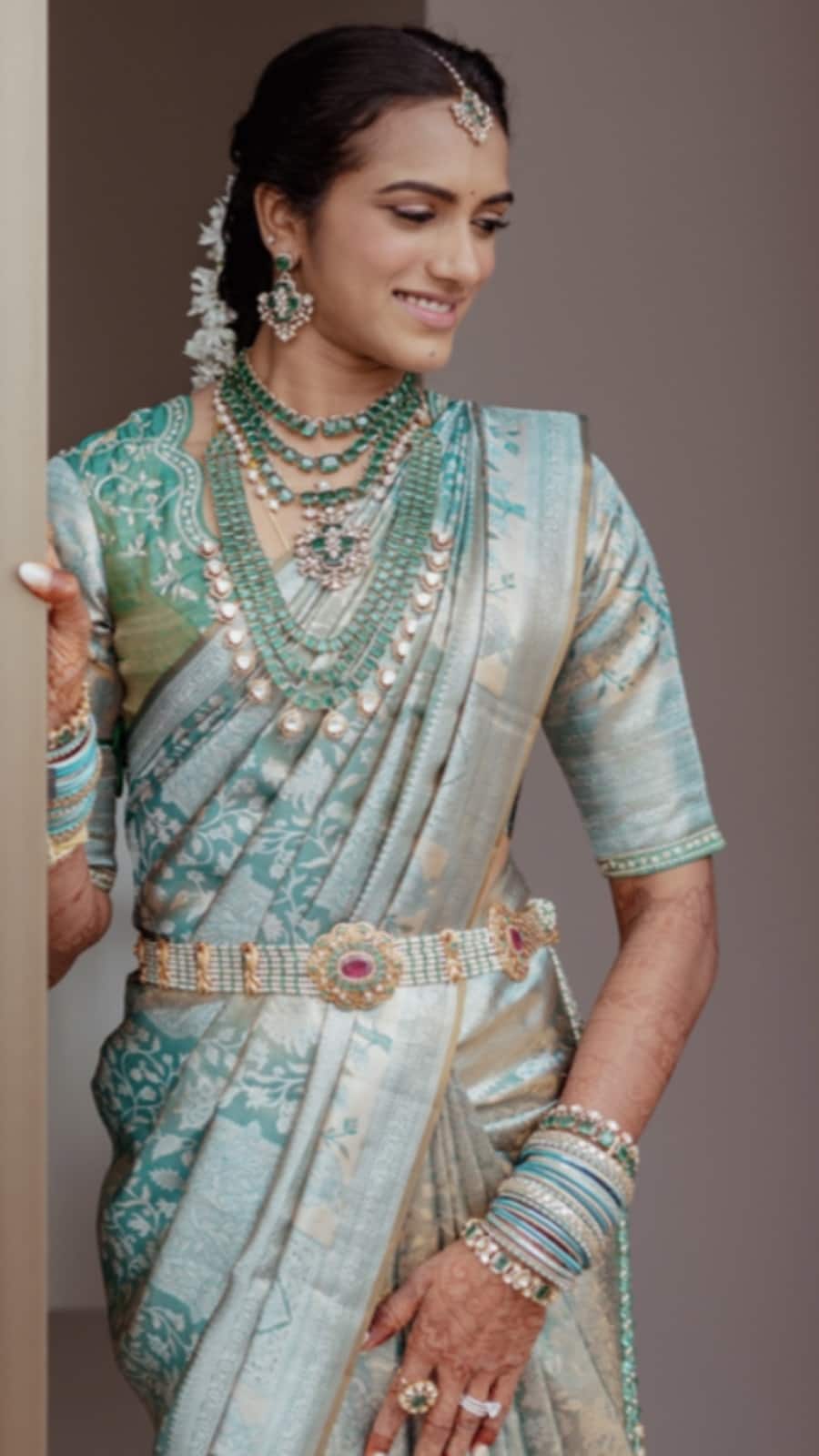 For her wedding reception, Sindhu chose a custom ivory tulle lehenga, embellished with beautiful Swarovski, sequins, and multi-coloured crystals. An elaborate diamond and emerald necklace completed the look