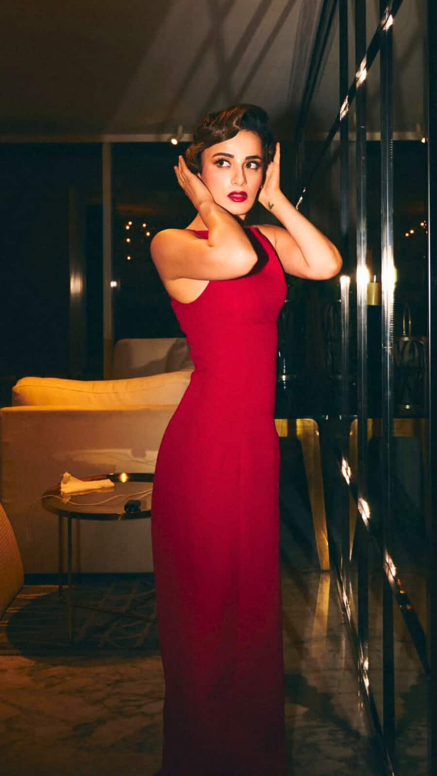 The actress stuns in a shimmering red dress worn over a white shirt and black tie