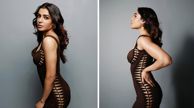 She skipped jewellery, opting for a minimalist touch with a pair of small golden hoops. Sharing the photos, the designer wrote, “Striking, sculpted, and unapologetically bold! Samantha in the Ebene! A sleek chocolate brown bodycon with handwoven detailing along the sides and bust.”
