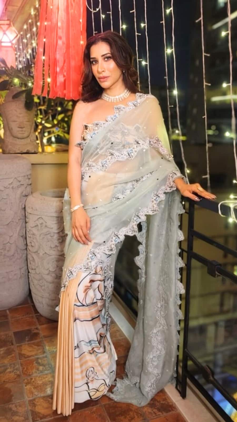The actress loves to style her sarees with either a modern blouse or a glamorous silhouette, as seen in this dazzling look