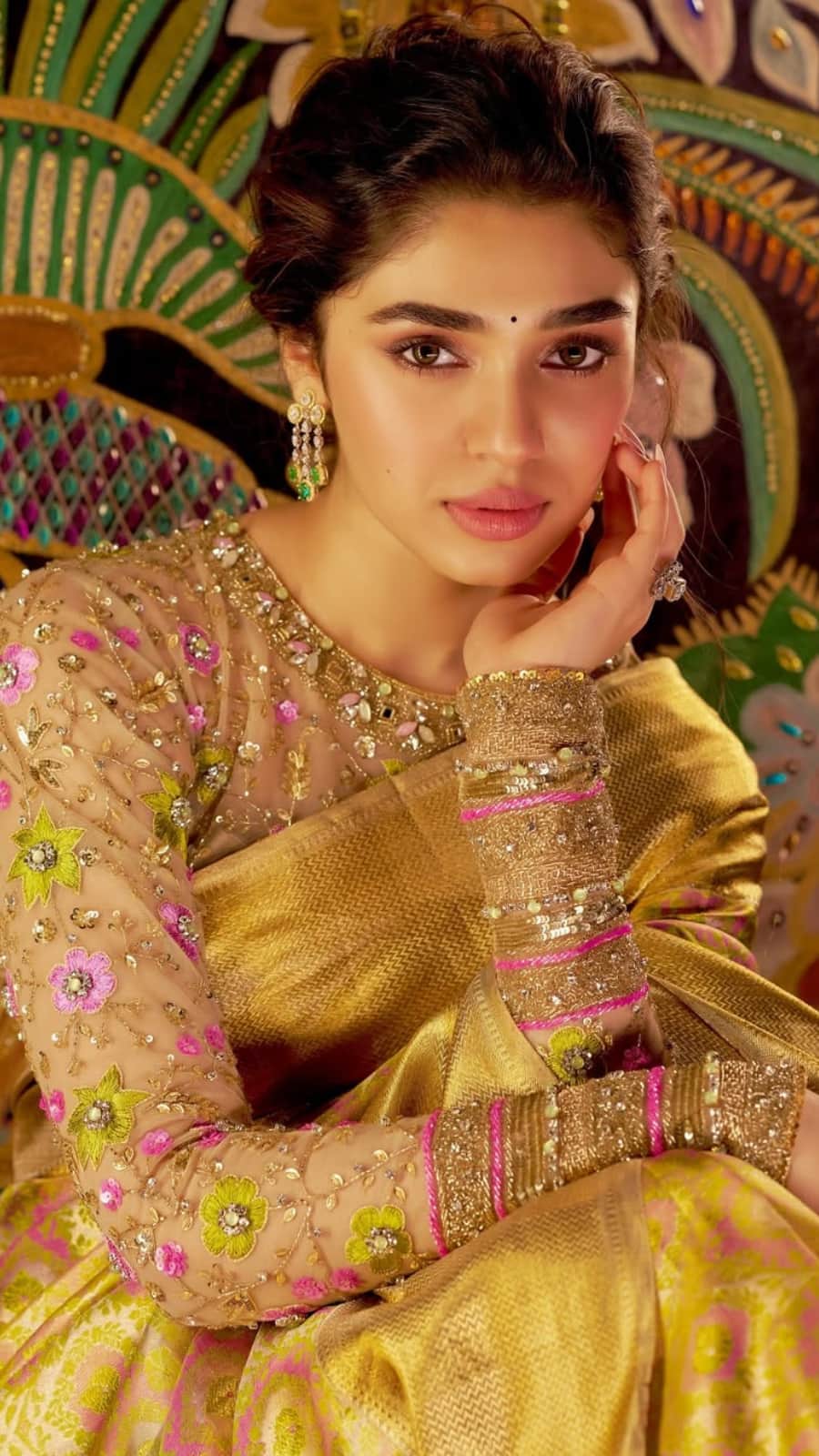 The actress stuns in a pink and gold traditional saree with an embroidered blouse. Her jewellery perfectly complements the attire