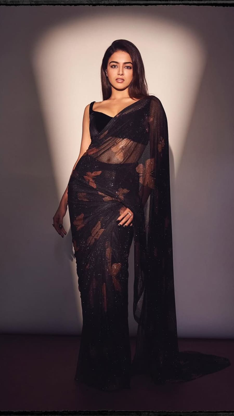 Her beauty shines through in a glamorous black saree adorned with sequins.