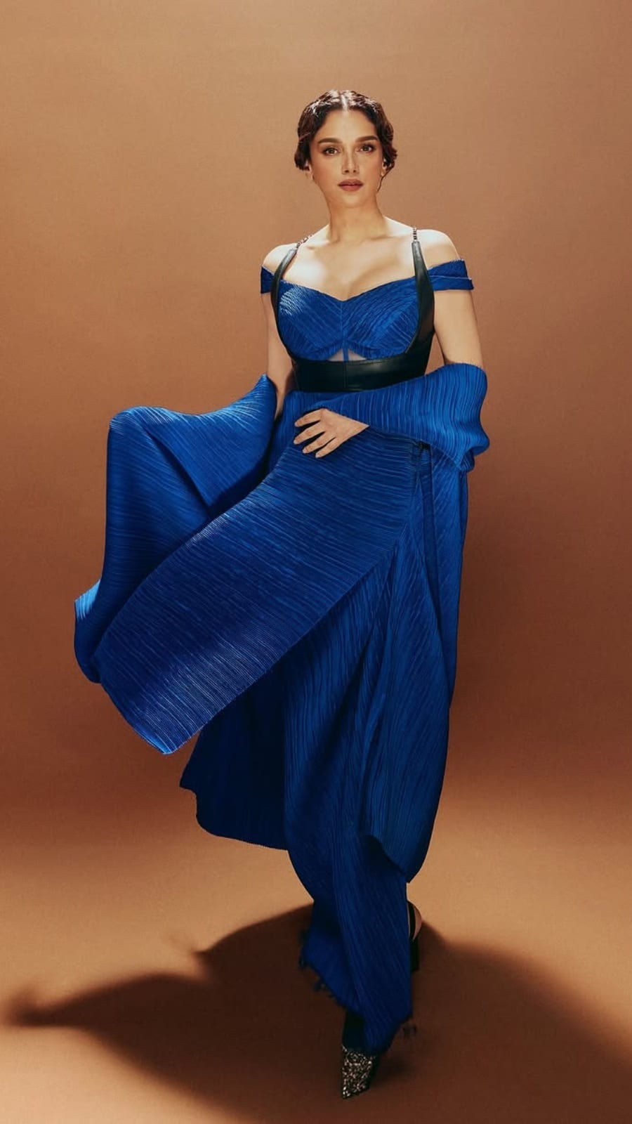Aditi looks dreamy in a one-shoulder gown. The simplicity of the silhouette evokes nostalgia, complemented perfectly by dusty blue pumps