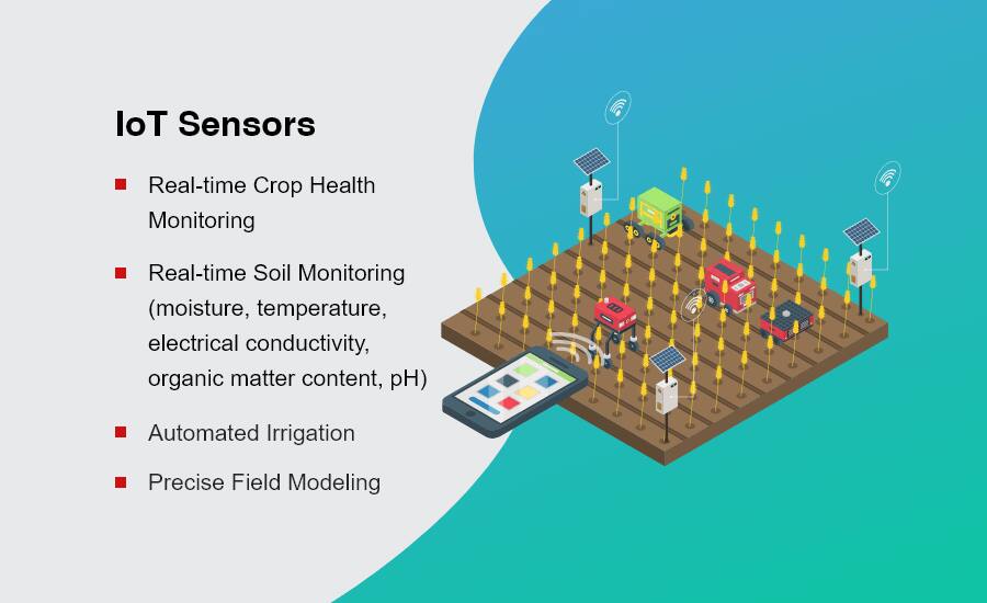 sensors detect moisture and nutrient levels helping farmers make informed decisions regarding the precise amount of chemicals and water needed to replenish the soil. The result is reduced waste, lowered costs, and increased yields.