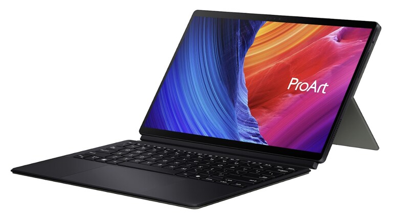 The ProArt PZ13, weighing 0.85 kg, features a 13.3-inch 3K Asus Lumina OLED touchscreen display, Qualcomm Snapdragon X Plus processor, 16GB LPDDR5X memory, and 1TB SSD. It includes advanced AI tools such as Microsoft's Copilot+ and Asus StoryCube, along with a detachable keyboard, Dolby Atmos audio, and a 70Wh battery.