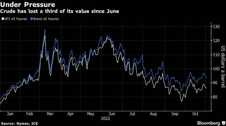West Texas Intermediate futures traded near $86 a barrel after losing around 3% over the previous two sessions. The Federal Reserve is scheduled to make a decision on rates on Wednesday, as central banks continue to tighten monetary policy to tame inflation. Meanwhile, the chief executive officer of top trader Vitol Group said oil demand had started to fall due to high prices.