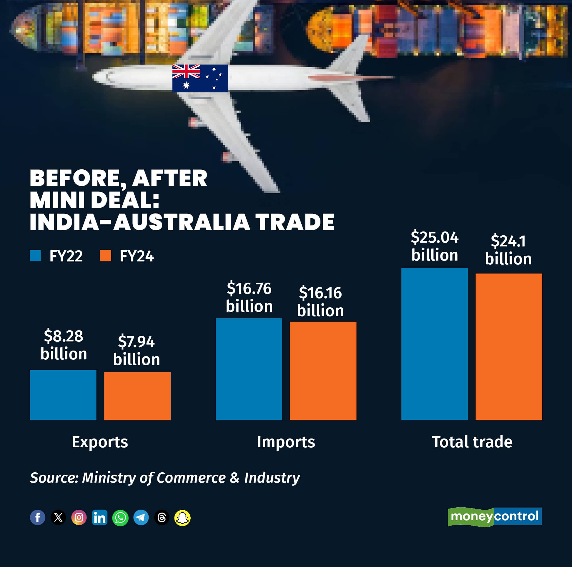 However, a closer look at the data reveals that merchandise trade between the two nations has slowed down since the deal was implemented to $24.1 billion in FY24 from $25.04 billion in FY22.