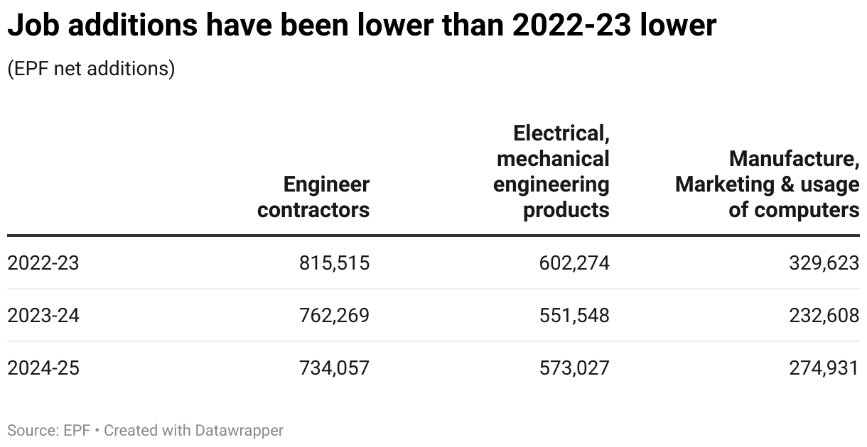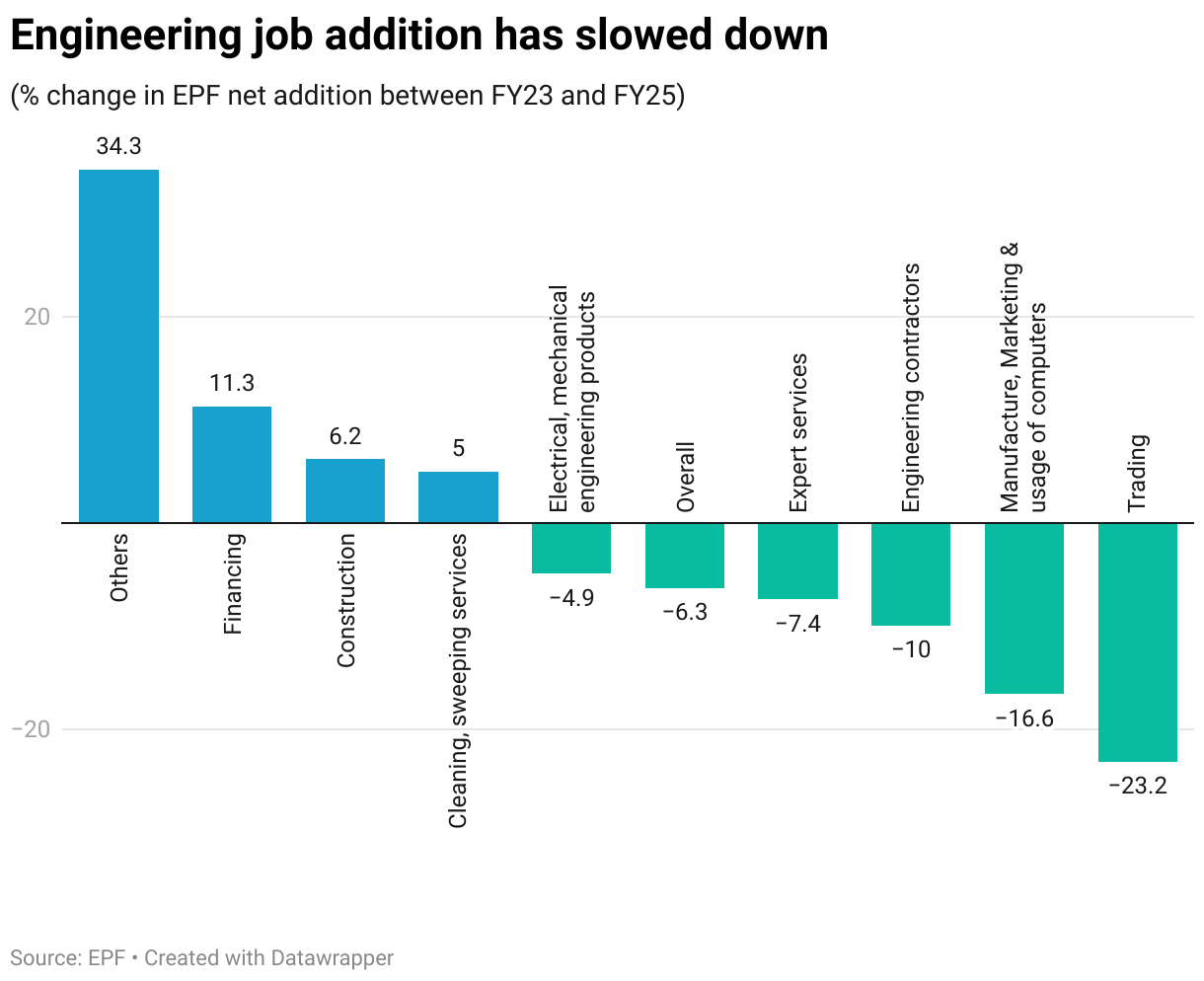 The weakness extends beyond engineering contractor roles. Establishments engaged in electrical, mechanical, and general engineering products witnessed a 4.9 percent decline in net job additions between FY23 and FY25. Their contribution to total EPFO-linked employment fell to 4.3 percent in FY24 and FY25, down from 4.9 percent in the two years before the pandemic.