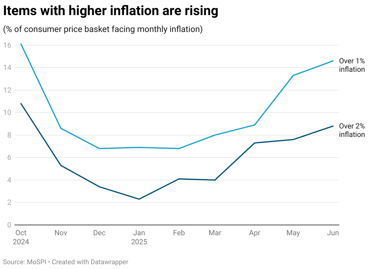 In the core goods category, gold, silver, and ornaments rose more than 2 percent, and umbrella/raincoat prices increased 1.2 percent—likely driven by the monsoon season.
