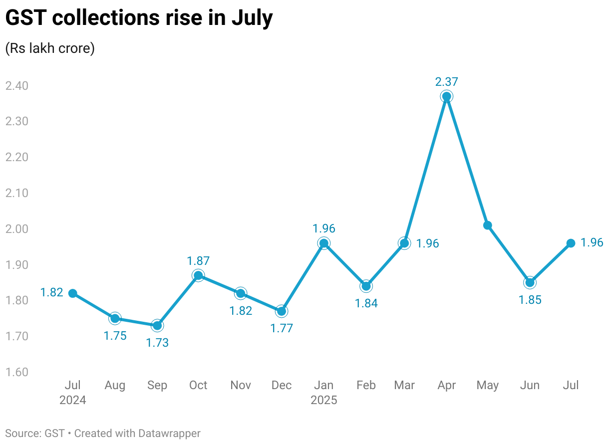 GST collections rose to Rs 1.96 lakh crore in July, recording a faster 7.5 percent increase from the year-ago period, according to data released by the government on August 1.