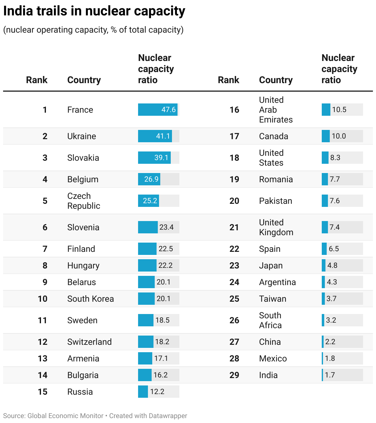 India's share of nuclear power is lower than China (2.2 percent) and Japan (4.8 percent), and much lower than Pakistan, where 7.6 percent of installed operating capacity comes from nuclear.
