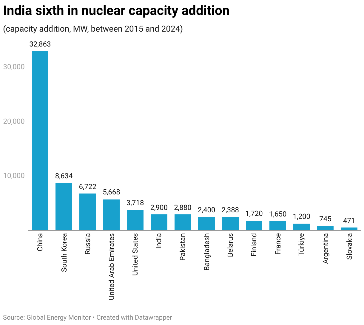 While India added a third of its total 8.7 GW nuclear capacity during the last decade alone, several neighbouring countries have moved at an even faster pace. Pakistan nearly matched India in nuclear capacity addition between 2015 and 2024, adding 80 percent of its reactors. Bangladesh, with 20 percent less nuclear capacity addition than India, added all of its reactors in the same period.
