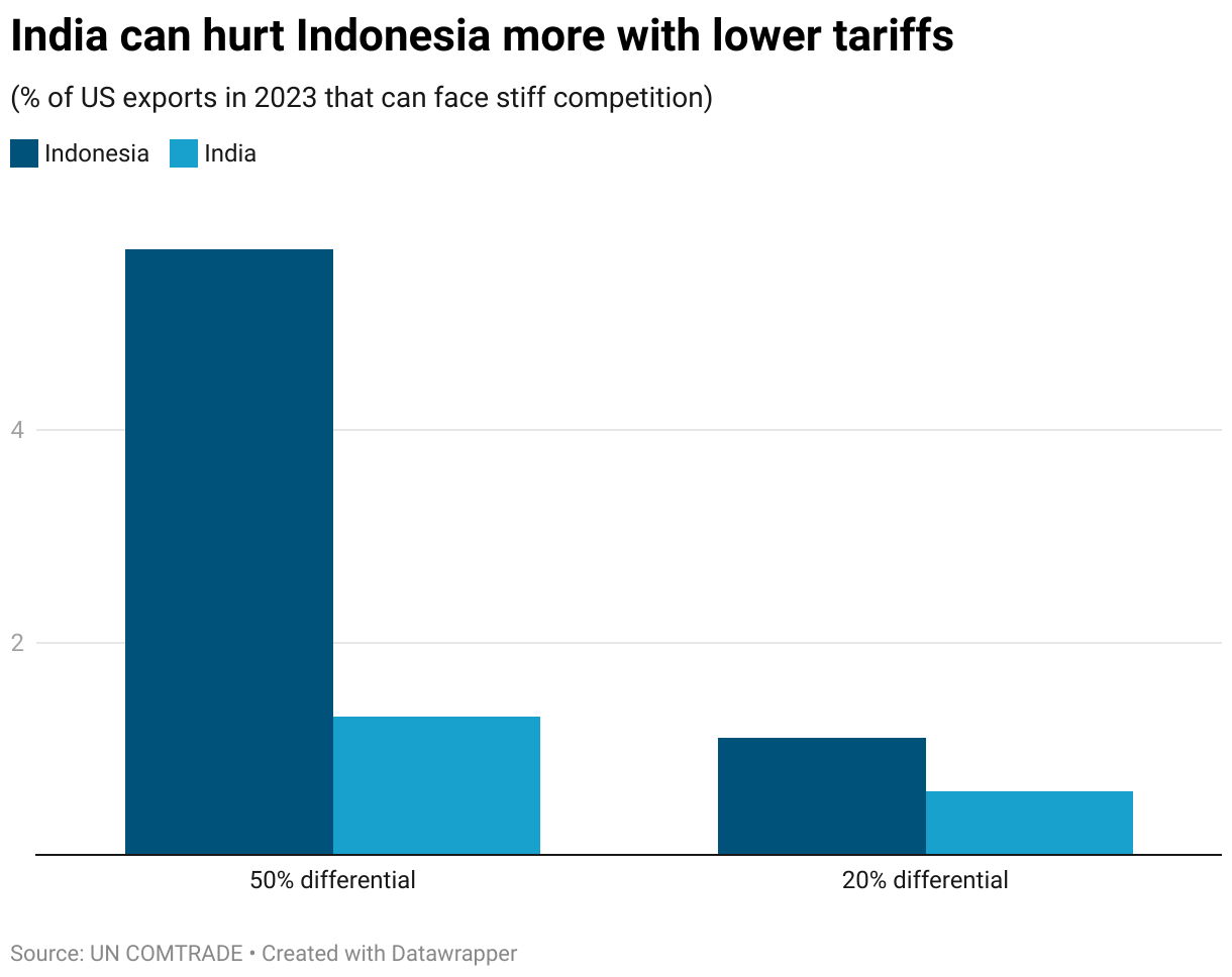 Even in scenarios where the tariff difference translates to just a 20 percent advantage in export value, Indonesia stands to lose nearly double of what India would.