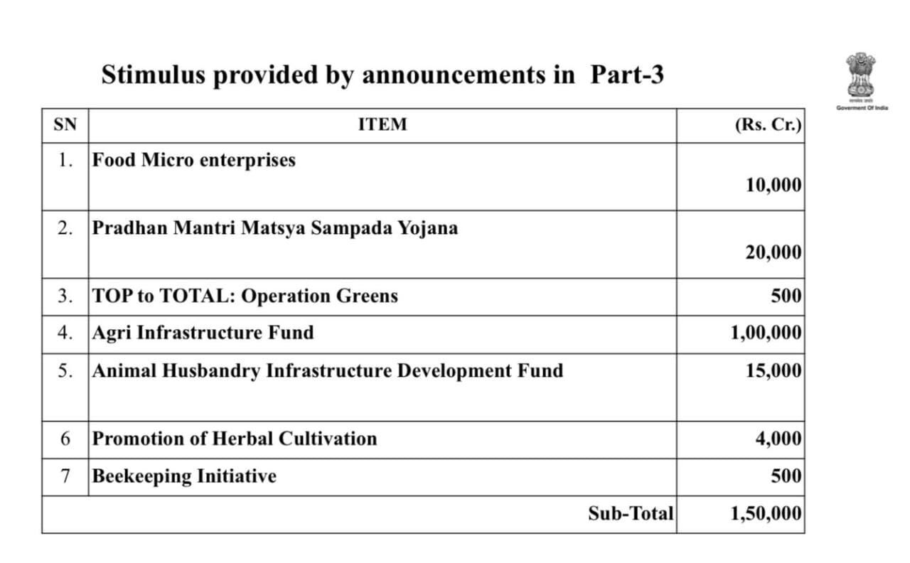 The third tranche on May 15 outlined measures for the agriculture and allied sectors, with a focus on small and marginal farmers.