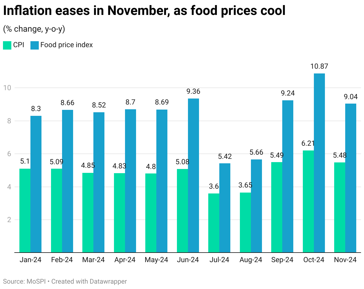 Food inflation had eased to 9 percent for the month compared with 10.9 percent in October.