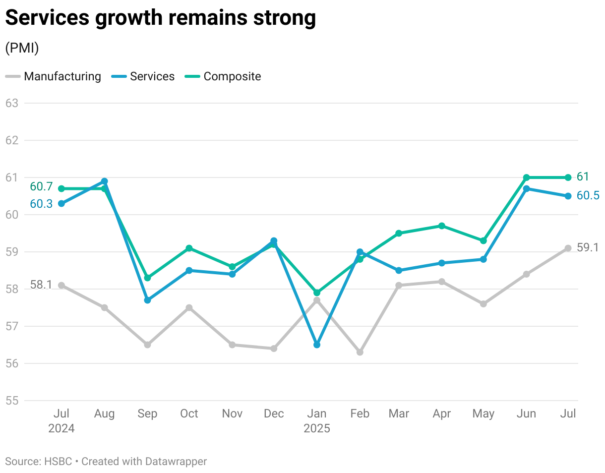 India’s services sector rose to an 11-month high at the start of the second quarter, with the HSBC Services Purchasing Managers’ Index (PMI) at 60.5 in July against 60.4 in June. This is the second consecutive month that the index has remained above the 60 mark, indicating a robust expansion.