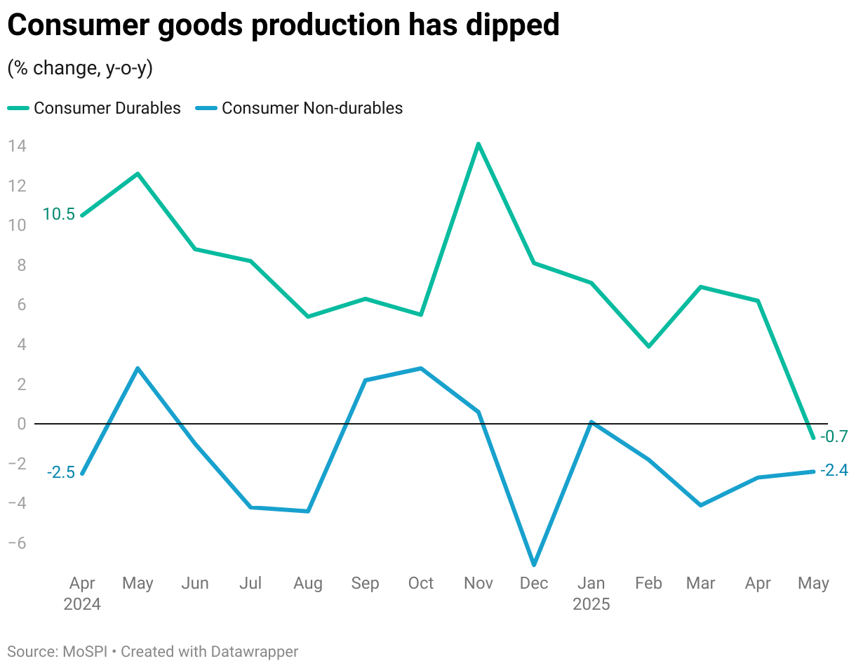 To be sure, consumer durables production, which includes household items like washing machines, cars, air conditioners, slipped into contraction in May, while the non-durables sector has been in negative territory for four consecutive months. In May alone, non-durable production (food and beverages, personal care and clothing and footwear) declined 2.4 percent year-on-year.