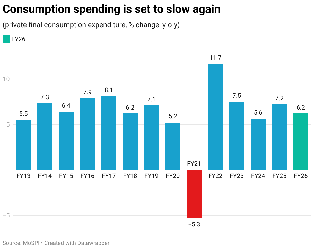 Private Final Consumption Expenditure (PFCE) rose to 7.2 percent in FY25 (2024–25) from 5.6 percent in the previous fiscal, but growth is expected to slow in FY26, lower than the 6.7 percent average over the last three years.