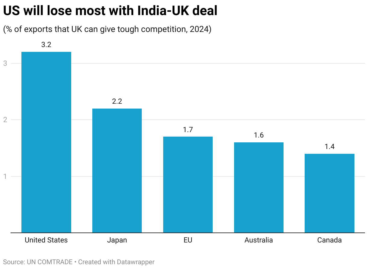 But the US is not alone. Japan, which exported $19.9 billion to India last year, may face competition in 2.2 percent of its exports, based on UN COMTRADE data. The European Union, with $48.3 billion in goods sold to India in 2024, will see 1.7 percent of its exports competing directly with UK products. Australia and Canada are also exposed, with potential impacts in 1.6 percent and 1.4 percent of their India-bound exports, respectively.