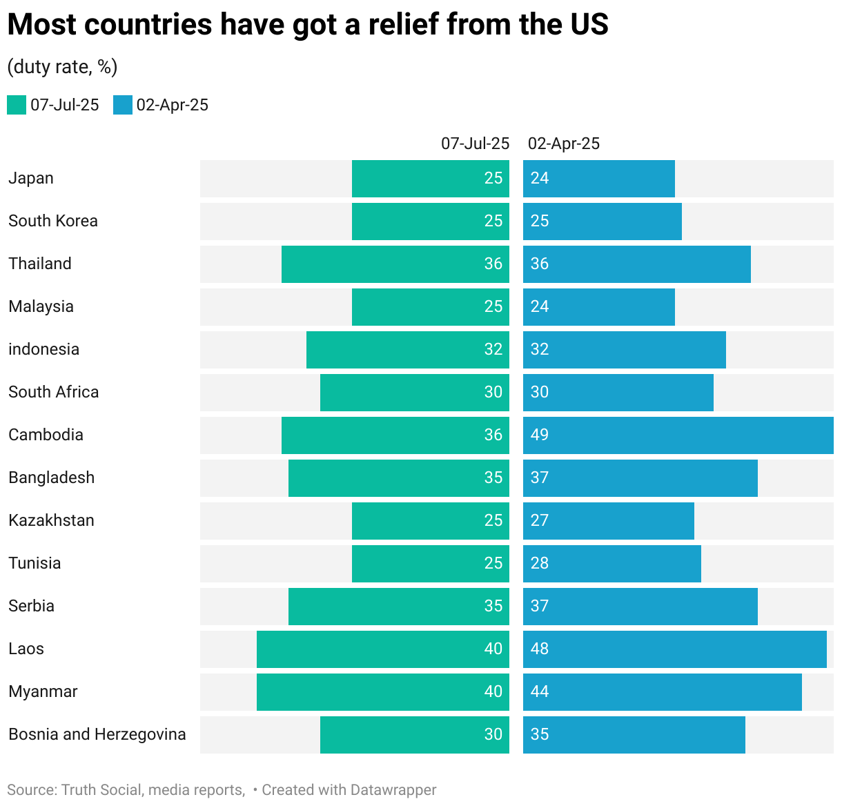 While some countries saw a rise in tariffs - such as Japan (now at 25 percent) and Malaysia – other nations have received a partial reprieve. Tariffs on Cambodia, Laos, and Myanmar were reduced to 36 percent, 40 percent, and 40 percent respectively, down from higher rates of 49 percent, 48 percent and 44 percent announced earlier in April 2.