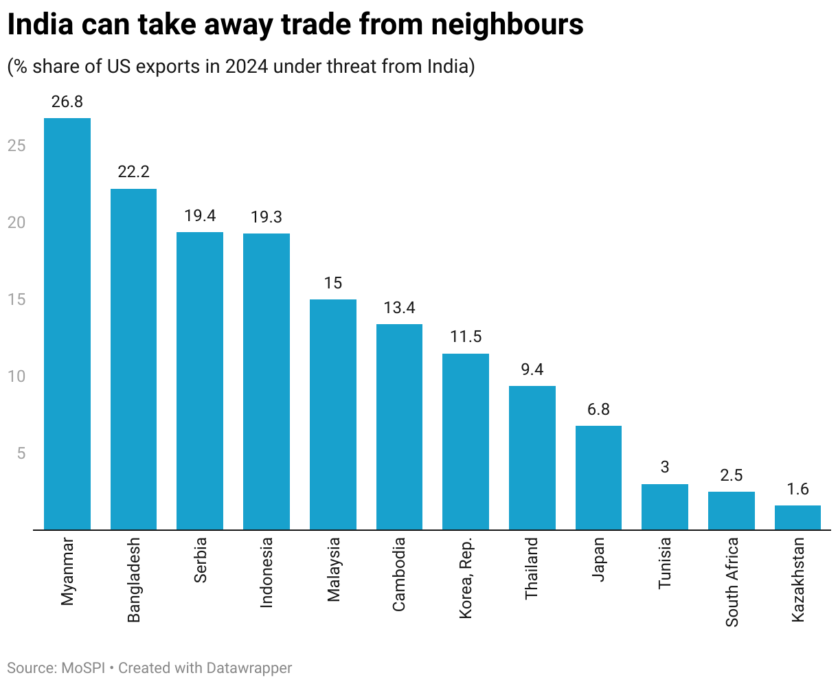 India’s neighbours too are vulnerable. In the case of Bangladesh, Indian exporters could look to claim over $1.3 billion worth of goods, especially in the textile segment where items like T-shirts, jerseys, and men’s shirts dominate US-bound exports. When it comes to Myanmar, India could potentially gain from over 25 percent of its $750 million in exports to the US. Indonesian exports may also face stiff competition from India, particularly in modems and garments. India could challenge nearly 19.3 percent of Indonesia’s trade with the US, with modem exports alone worth $1 billion and jerseys valued at over $500 million in 2024.