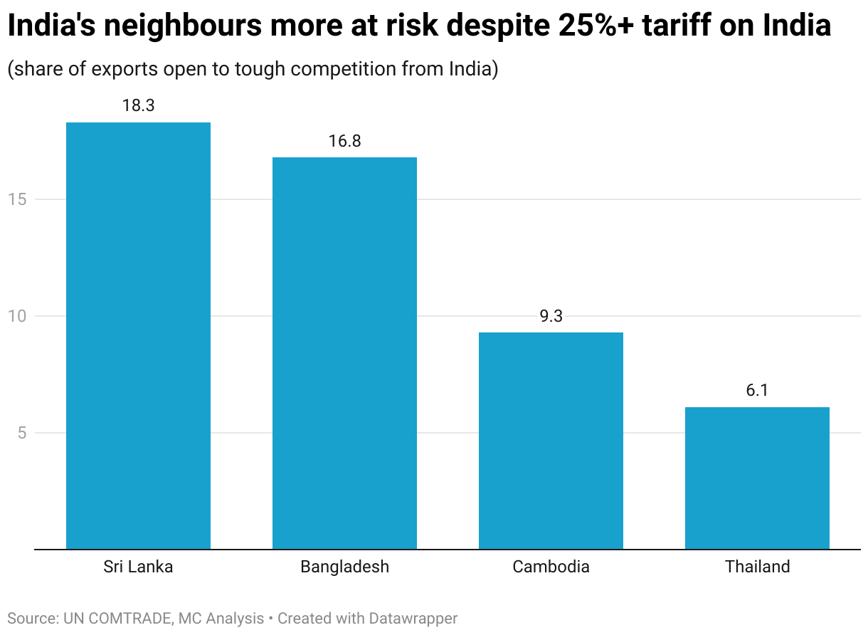 Bangladesh and Sri Lanka are expected to be the most impacted. Sri Lanka faces a 30 percent US tariff—5 percentage points higher than India—making 18 percent of its exports vulnerable to Indian competition, the highest among the group.
