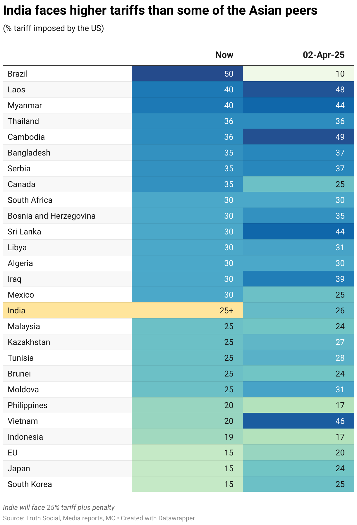 While the 25 percent tariff imposed by the US may hurt Indian exporters' competitiveness relative to Vietnam, Indonesia, and the Philippines starting August 1, it may improve India’s standing against regional rivals such as Bangladesh, Sri Lanka, Thailand, and Cambodia, a Moneycontrol analysis shows.