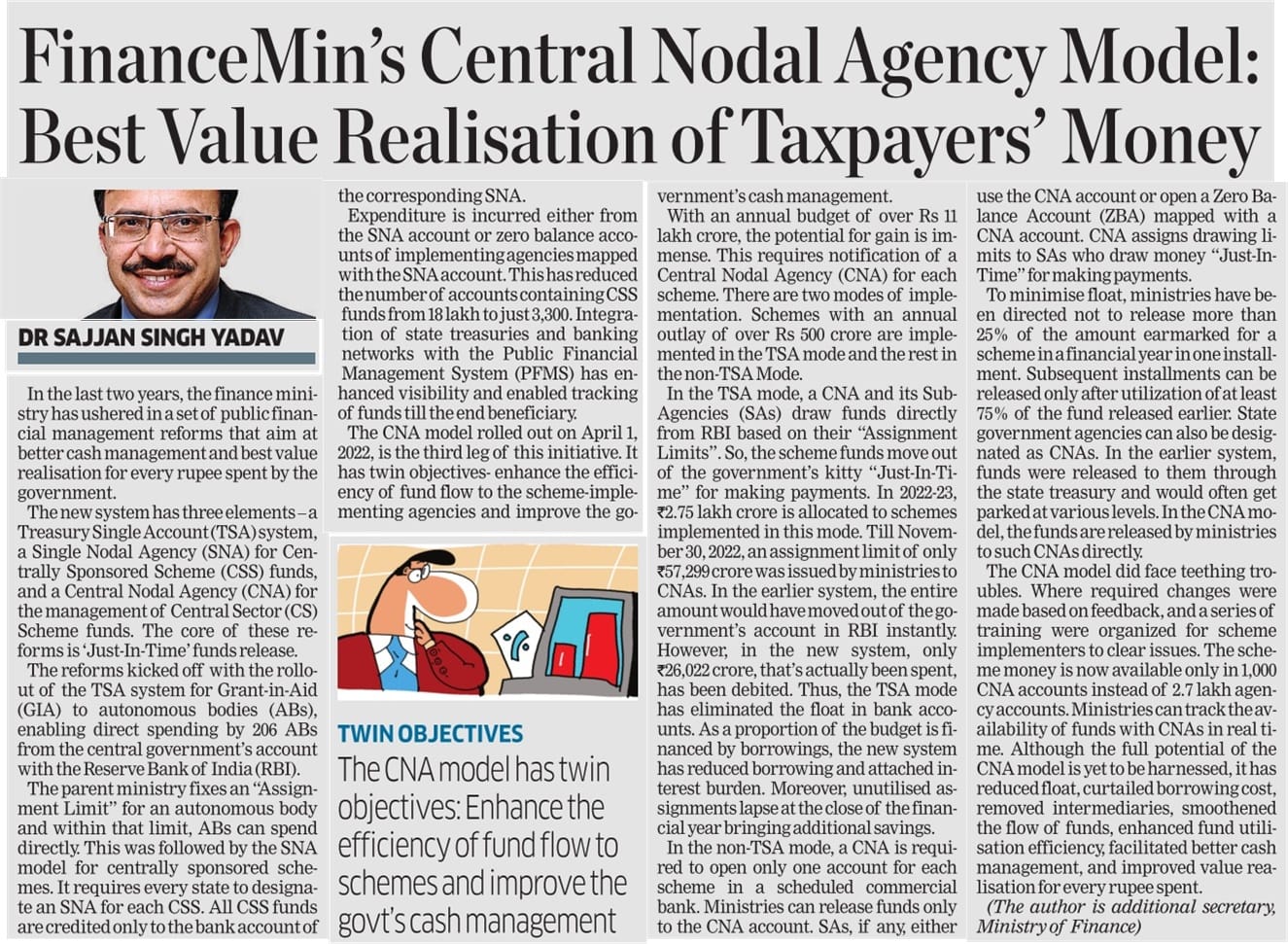 The CNA model, which came into effect on April 1, 2022, dictates that a central nodal agency be notified for each scheme. Schemes with an annual outlay of more than Rs 500 crore and implemented without the involvement of state agencies have to be routed through the TSA, which ensures these funds are released ‘just in time’.