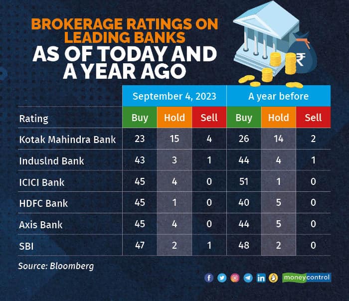 Kotak Mahindra Bank stock had 23 "buy" calls from brokerages as of September 4 morning, down from 26 "buy" recommendations a year ago, and 15 "hold", and four "sell" calls compared to 14 "hold" and two "sell" calls during the same period.