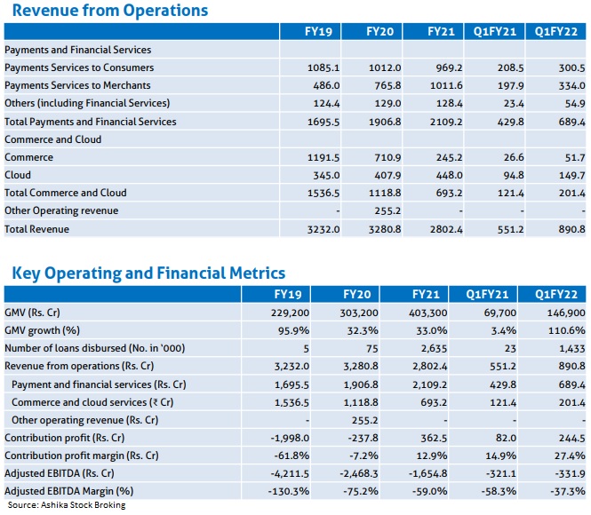 "At the upper end of the IPO price band, One 97 Communications Ltd. is offered at P/B of 9.5x with a market capitalization of Rs 1,39,378.8 crore. The company benefits from both customer side and merchant side by providing payment and other services through Paytm app, the company further aims to expand its reach and benefit from scale which is challenging for other players. The company reported contribution profit of Rs 363 croreand EBITDA loss of Rs 1,655 crorein FY21. Given that the company’s ecosystem allows it to address large market opportunities, scale and reach, product, technology and leadership," says Anand Rathi which gives this IPO a "Subscribe (Long-Term)" rating.