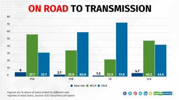The time gap between Reserve Bank of India’s policy rate changes and lending rate revisions by banks needs to be the barest minimum for monetary policy to be effective. Effective transmission has been a long learning for the regulator, one that the RBI has become better by practice. From the base rate regime that was replaced by the marginal cost based lending rate (MCLR) and now finally to external benchmark linked rate (EBLR), transmission of policy rate changes on to lending rates has quickened. As the chart above shows, EBLR linked loans are now more than 40 percent of the loan book of commercial banks while base rate is almost negligible. MCLR too is getting phased out as external benchmark gets adopted progressively. What’s more is the adoption of a new loan pricing regime is quicker during times of policy tightening. Therefore, the share of EBLR linked pricing in the loan book would surge from here on and that augurs well for margins. Private sector banks have adopted EBLR faster than public sector peers, which could be the reason behind the superior margins of the former. That said, MCLR’s share is unlikely to slip as some corporate loans could continue to be priced with it.