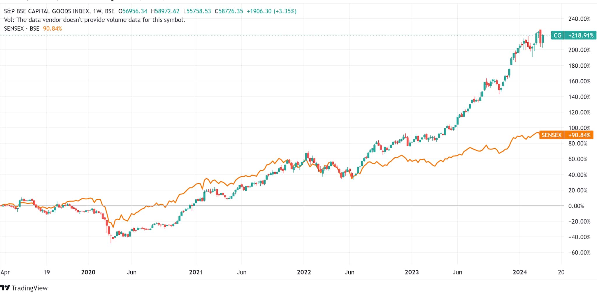 The chart below explains the outperformance of BSE Capital Goods Index over BSE Sensex in the previous five years. The BSE Capital Goods index has delivered almost double the returns of the BSE Sensex in this period.