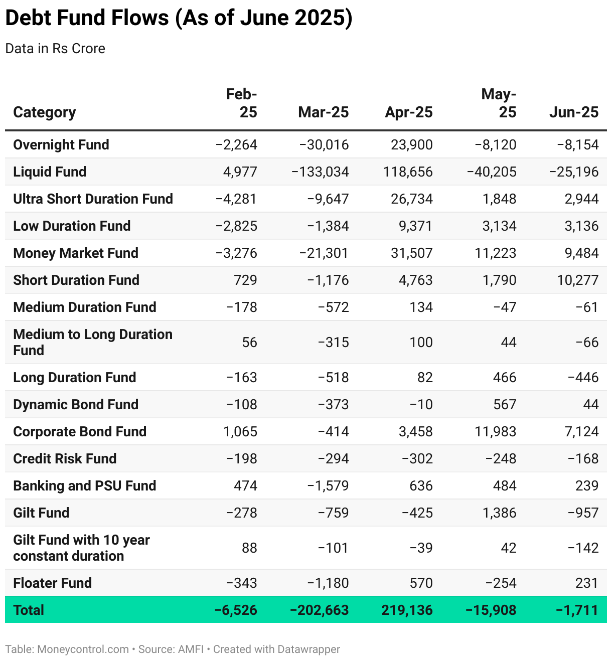 Open-ended income/debt-oriented mutual funds saw net outflows of Rs 1,711 crore, a 89 percent month on month increase from Rs 15,908 crore in May. Liquid Funds continued to see heavy outflows at Rs 25,196 crore, though down 37% from May’s Rs 40,205 crore. Overnight Funds also remained negative with Rs 8,154 crore outflows, flat month-on-month. Shorter-duration categories saw strong inflows. Ultra Short Duration Funds rose 59% to Rs 2,944 crore, while Low Duration Funds were steady at Rs 3,136 crore.