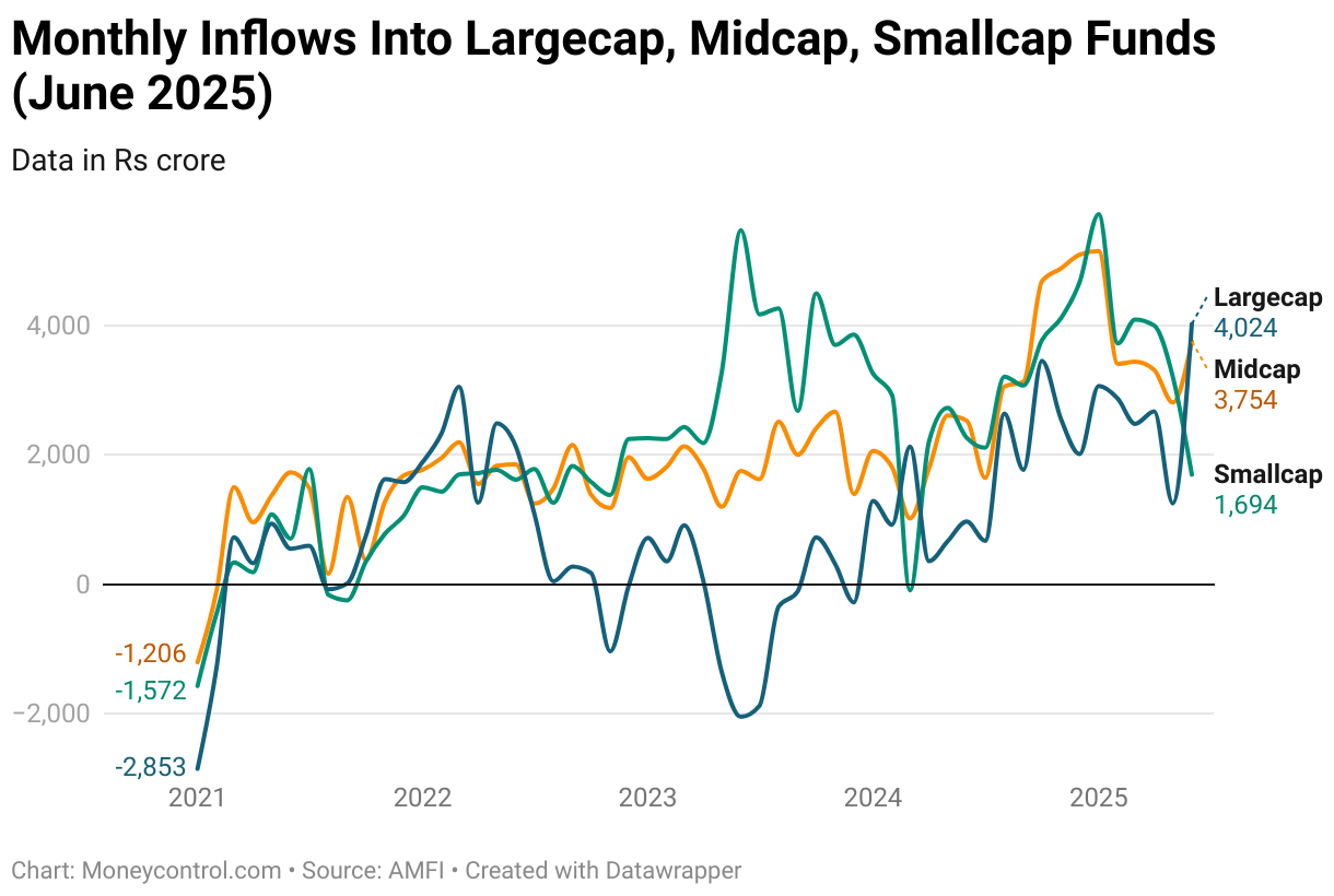 In the Equity categry, large cap funds led gains with inflows of Rs 1,694 crore in June, rising 35% from Rs 1,250.5 crore in the previous month. Small Cap Funds led gains in open-ended schemes with inflows of Rs 4,024.5 crore, up 25% from Rs 3,214 crore in May. Mid Cap Funds also recorded inflows of Rs 3,754 crore, marking a 34% increase from Rs 2,808.7 crore month-on-month.