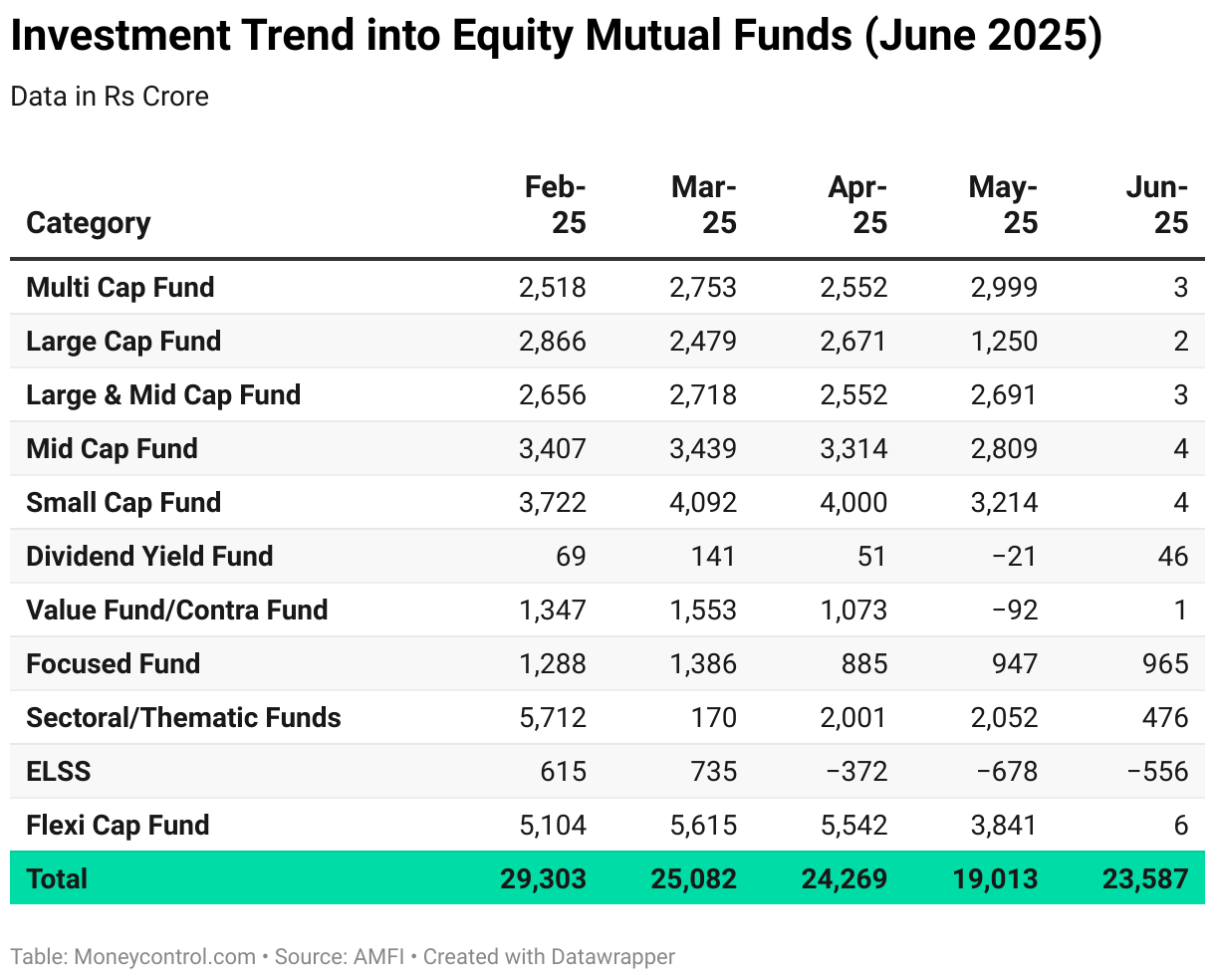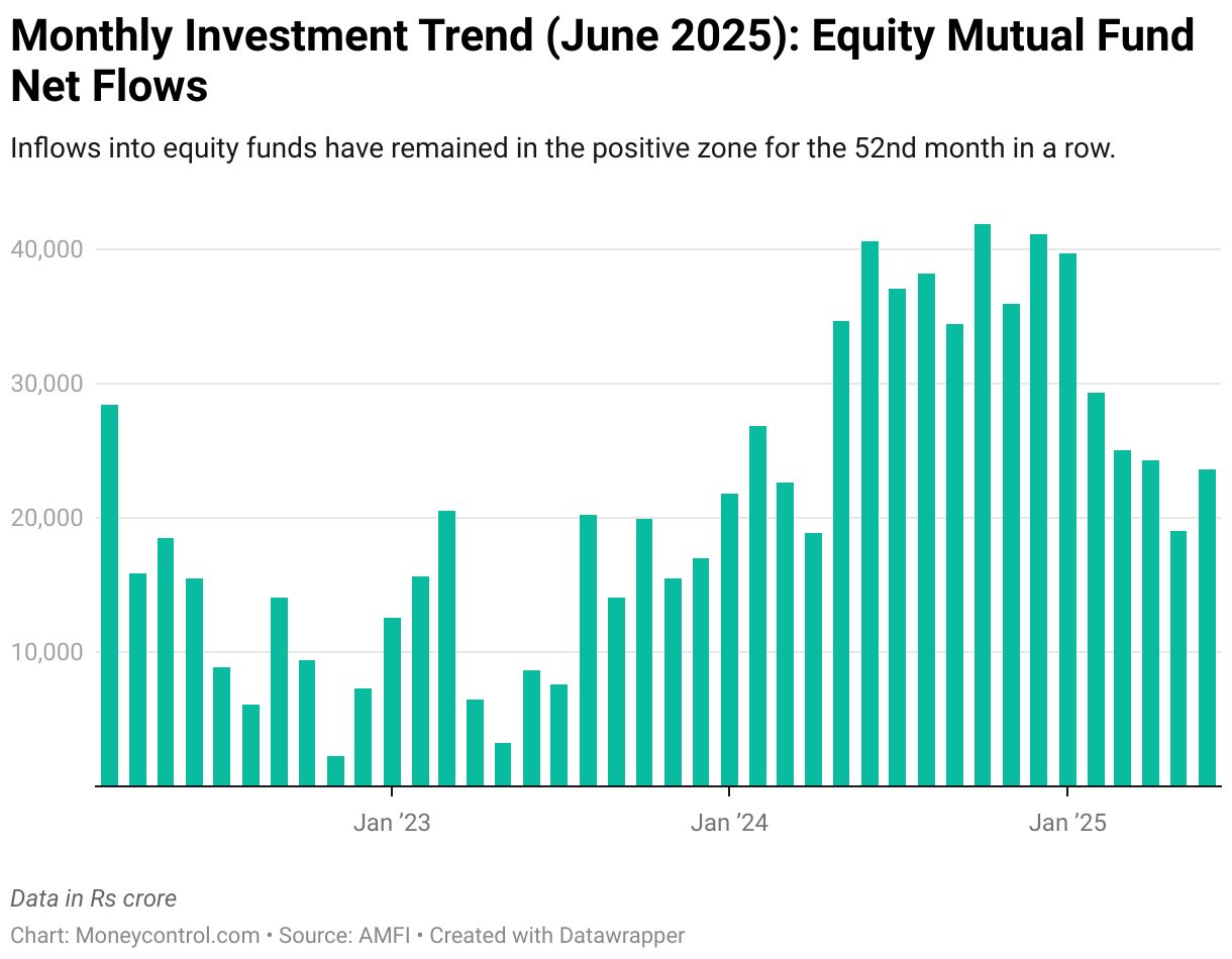 After a sharp 22% decline in May, equity mutual fund inflows showed a 24% rise in June, coming in at Rs 23,587 crore, according to monthly data released by the Association of Mutual Funds in India (AMFI) on July 9. Market benchmarks remained largely stable and investor sentiment appeared to reflect this optimism. During the month of June, Nifty gained 2.7 percent, while the Sensex gained 3.1 percent despite continued uncertainty amidst global trade tensions and geopolitical conflicts in the Middle East.