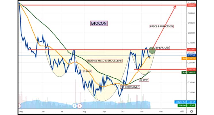 > Entire bullish view negates on breaching of right shoulder on closing basis and one should exit from long position. In case of Biocon it is placed around Rs 240 levels.