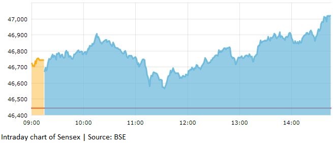 Sensex closed 529 points, or 1.14 percent, higher at 46,973.54 while Nifty settled at 13,749.25, with a gain of 148 points or 1.09 percent.