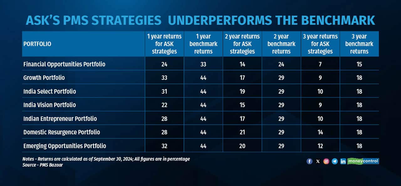 Another possible reason for investors leaving ASK PMS could be a larger AUM, said another ASK distributor on the condition of anonymity. The person added that there is a perception that smaller the AUM, better will be the returns. Plus, PMS firms with smaller AUMs are able to offer certain niche, so investors many-a-times prefer such firms over the larger ones.