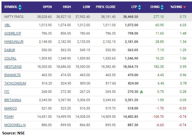 NSE FMCG index added 0.7 percent led by the Varun Beverages, Hindustan Unilever, Godrej Consumer Products