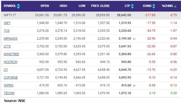 Nifty Information Technology index shed 0.7 percent dragged by the Infosys, TCS, Mphasis