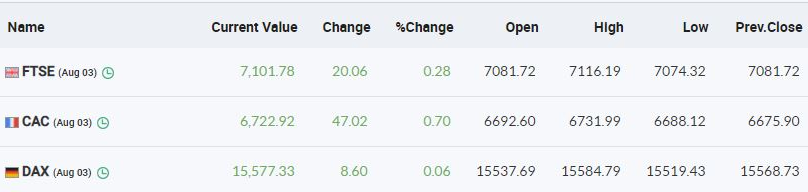 European markets are trading in the green with FTSE and CAC up half a percent each