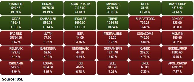 IndusInd Bank, Tata Motors, ONGC, Kotak Mahindra Bank and HUL were among the top Nifty losers. Gainers included Wipro, Infosys, HCL Technologies, Power Grid Corporation and Sun Pharma.